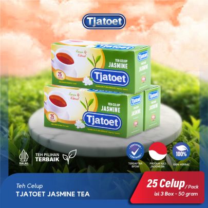 Tjatoet Jasmine 50gr [3 Box @25 kantong/ 2gr] merupakan teh bubuk berkualitas yang dihasilkan dari perpaduan antara teh hijau dengan bunga melati melalui beberapa proses pengolahan untuk mendapatkan keharuman melati, manis, dan rasa teh yang lezat yang membuat suasana menjadi relax bagi peminumnya.